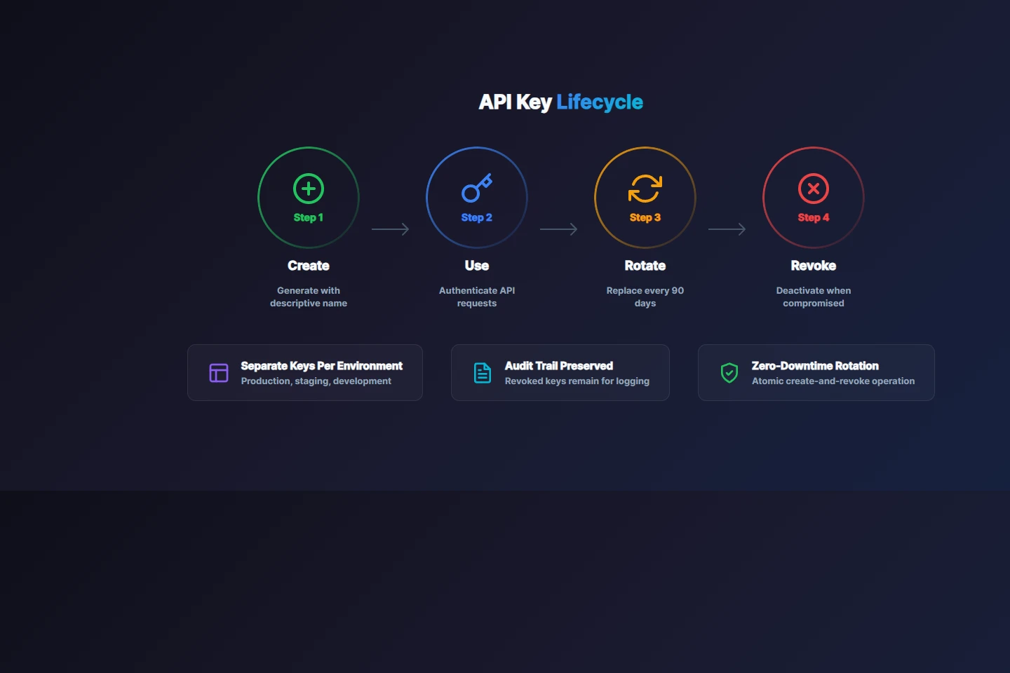 - Update your environment variables — Push the new key to your secrets manager (AWS Secrets Manager, HashiCorp Vault, GitHub Secrets)
