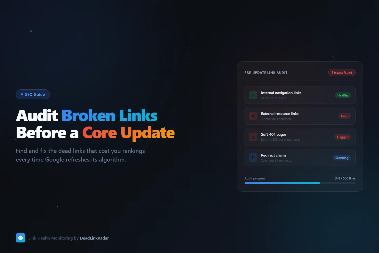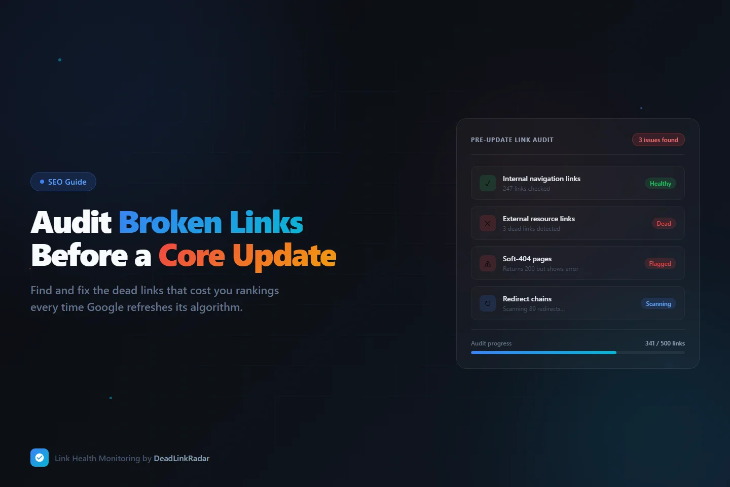 This guide walks you through how to find and fix broken links before a Google Core Update lands, what link types to prioritize, and how to set up monitoring so you don't have to scramble before every future update.