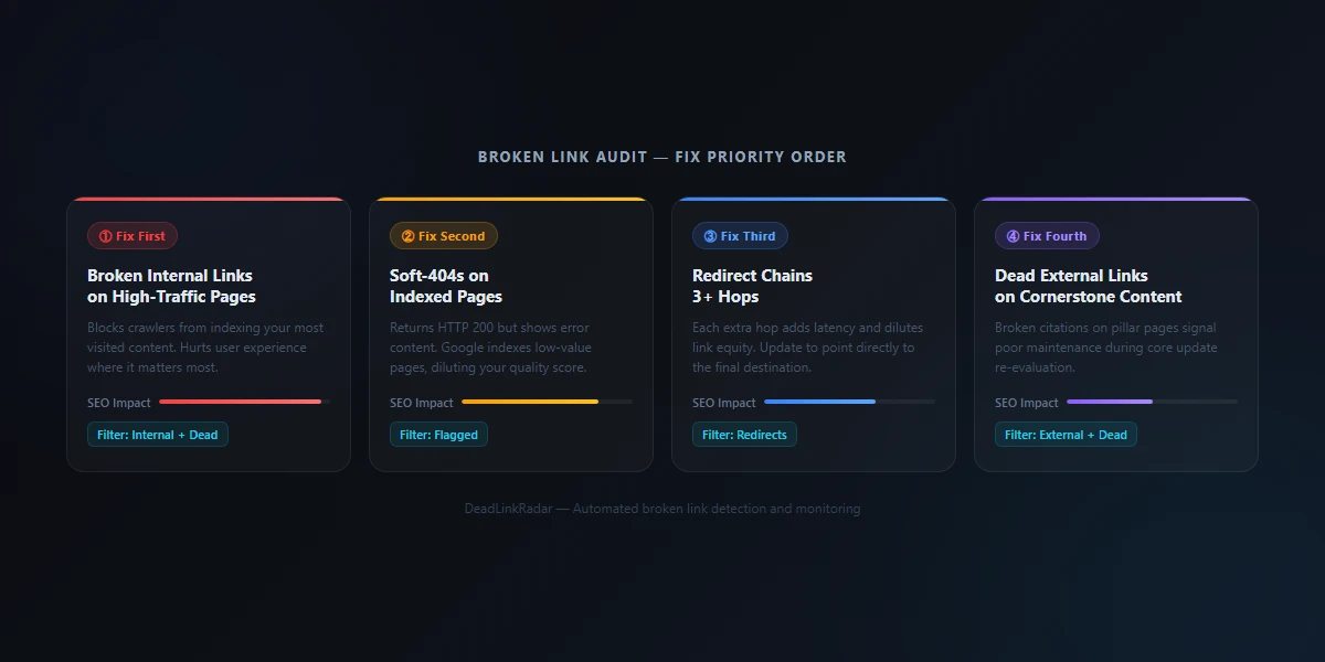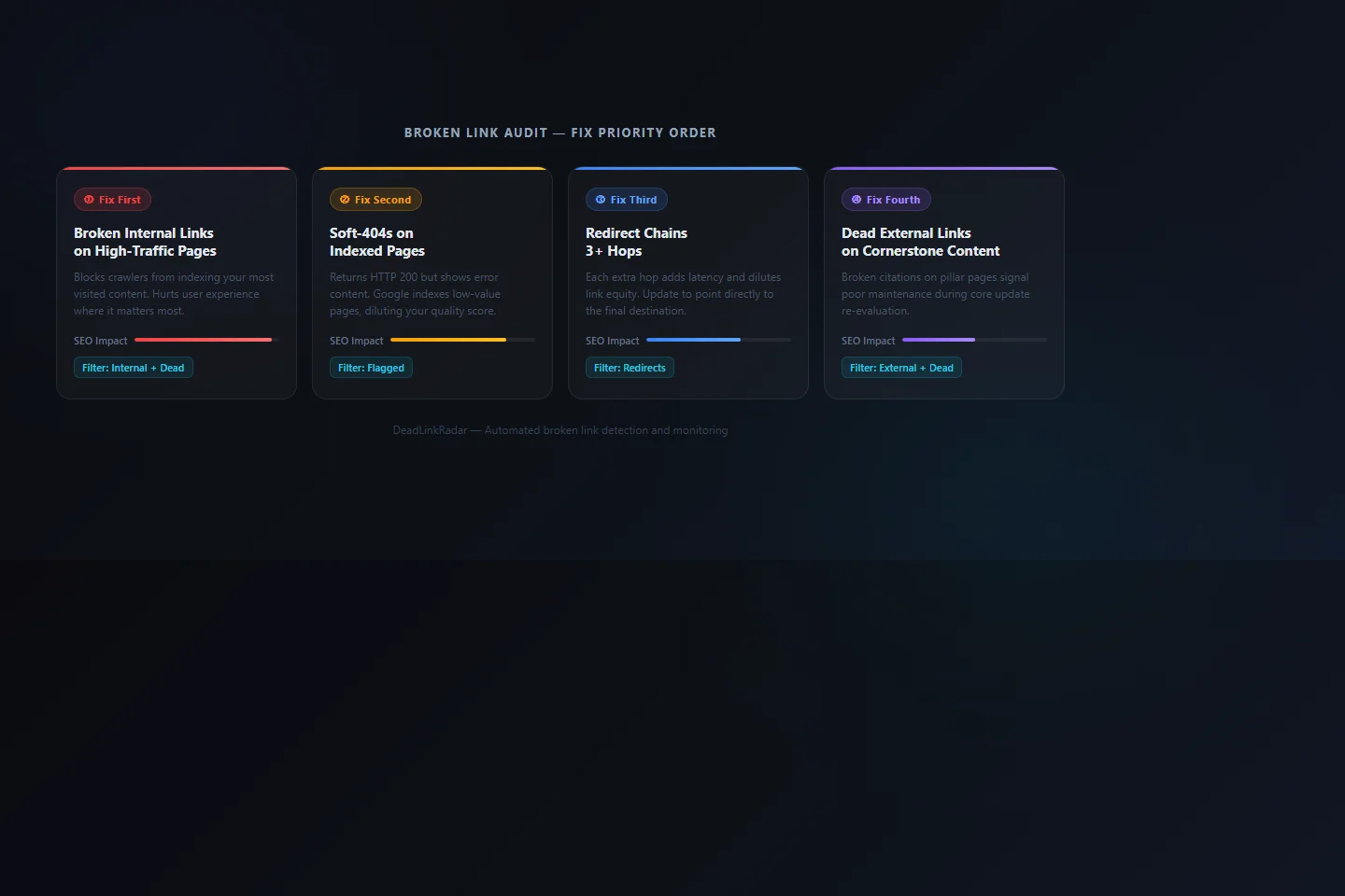 Fix first: Broken internal links on high-traffic pages. Filter your DeadLinkRadar results to show internal links with a dead status. Sort by the page they appear on, then cross-reference against your analytics to find which source pages drive the most traffic. A dead link in a navigation element or a pillar post is your most urgent fix.