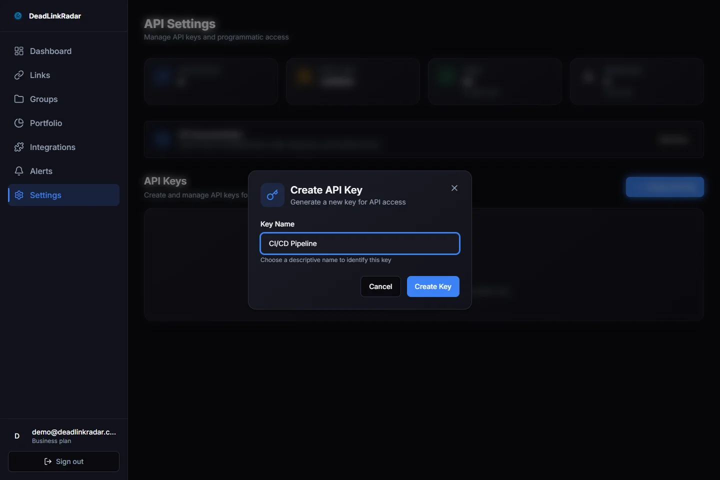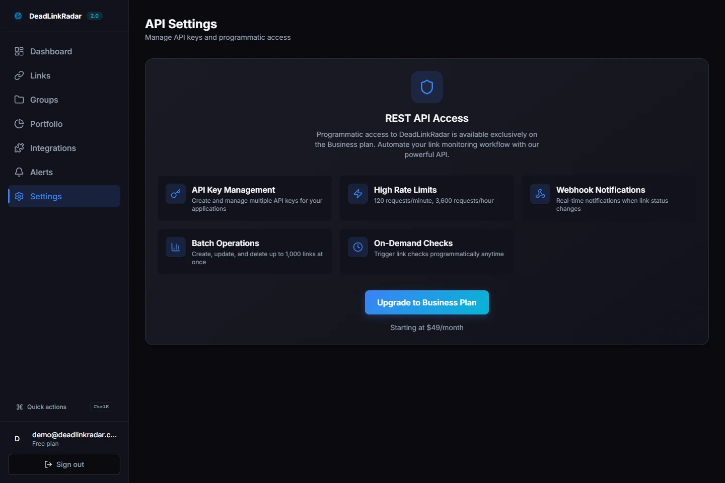 - DeadLinkRadar Business plan - API access requires a Business subscription (view pricing)
