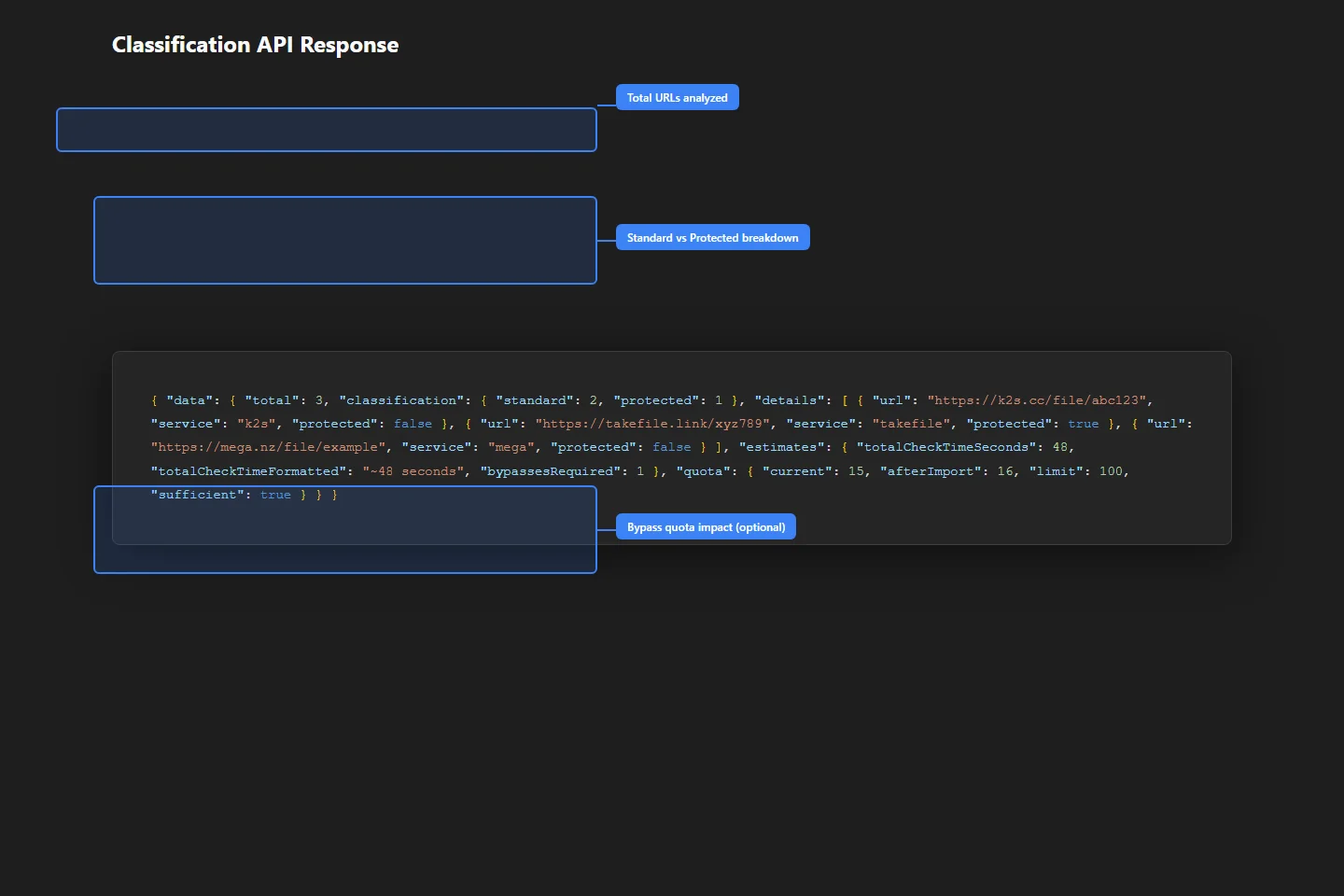 The classification API analyzes batches of URLs and returns detailed categorization data including service detection, check time estimates, and optional quota impact calculations.
