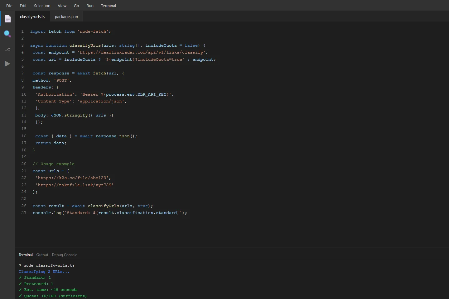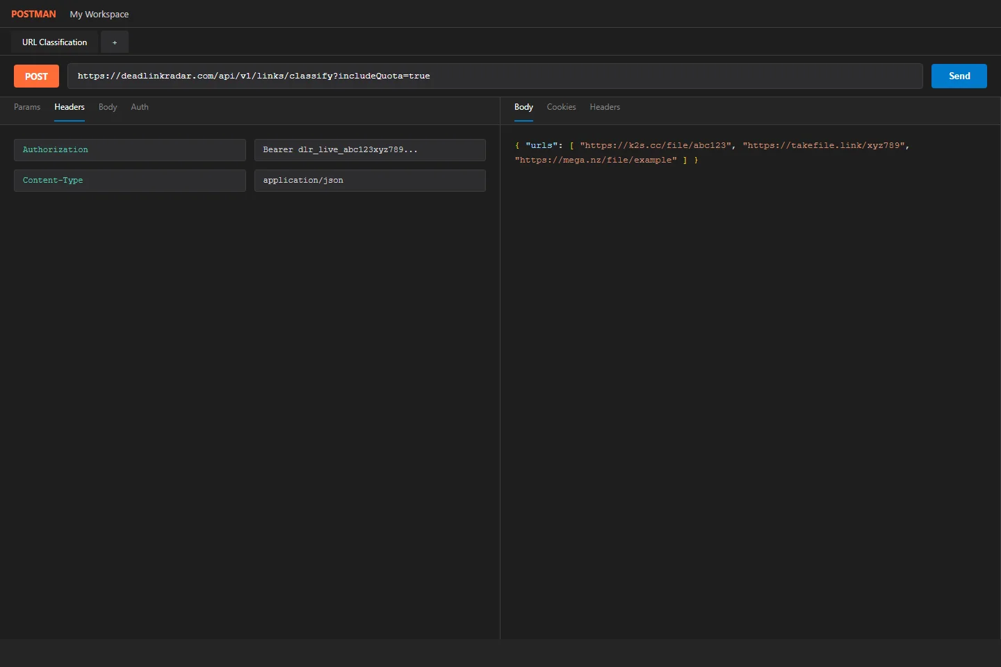 curl -X POST "https://deadlinkradar.com/api/v1/links/classify?includeQuota=true" \