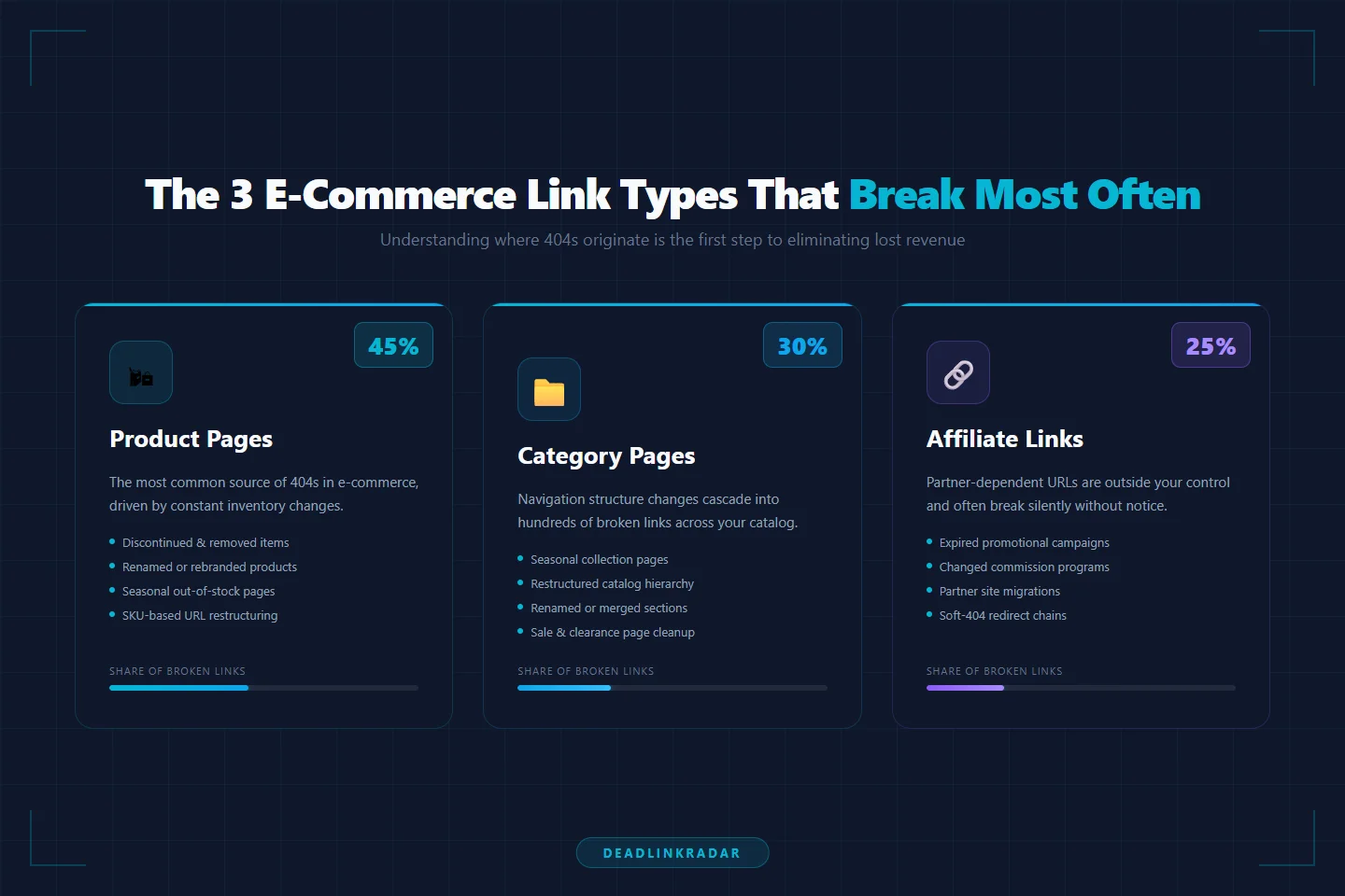 The three link types that generate the most broken links in e-commerce stores.