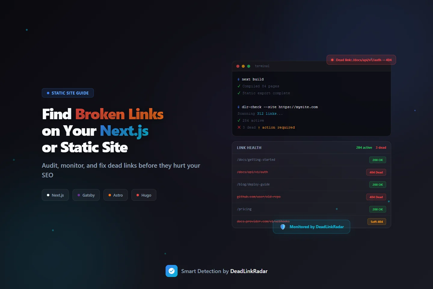When you ship a Next.js or Gatsby site, your broken link checker options out of the box are essentially zero. The build process validates your code—not whether the URLs in your content are alive. A link to an external documentation page can break an hour after you deploy, and your CI/CD pipeline will never flag it. The next morning, visitors land on a 404 with no indication anything went wrong.