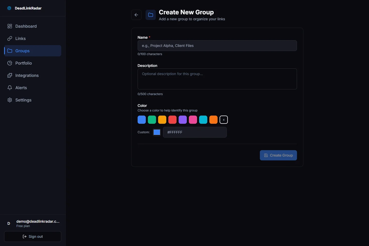 Link groups work like folders for your monitored URLs. Each group has a name, optional description, and a color that makes it instantly recognizable in your dashboard. When you check for broken links across hundreds of URLs, these visual distinctions become essential for quick navigation.
