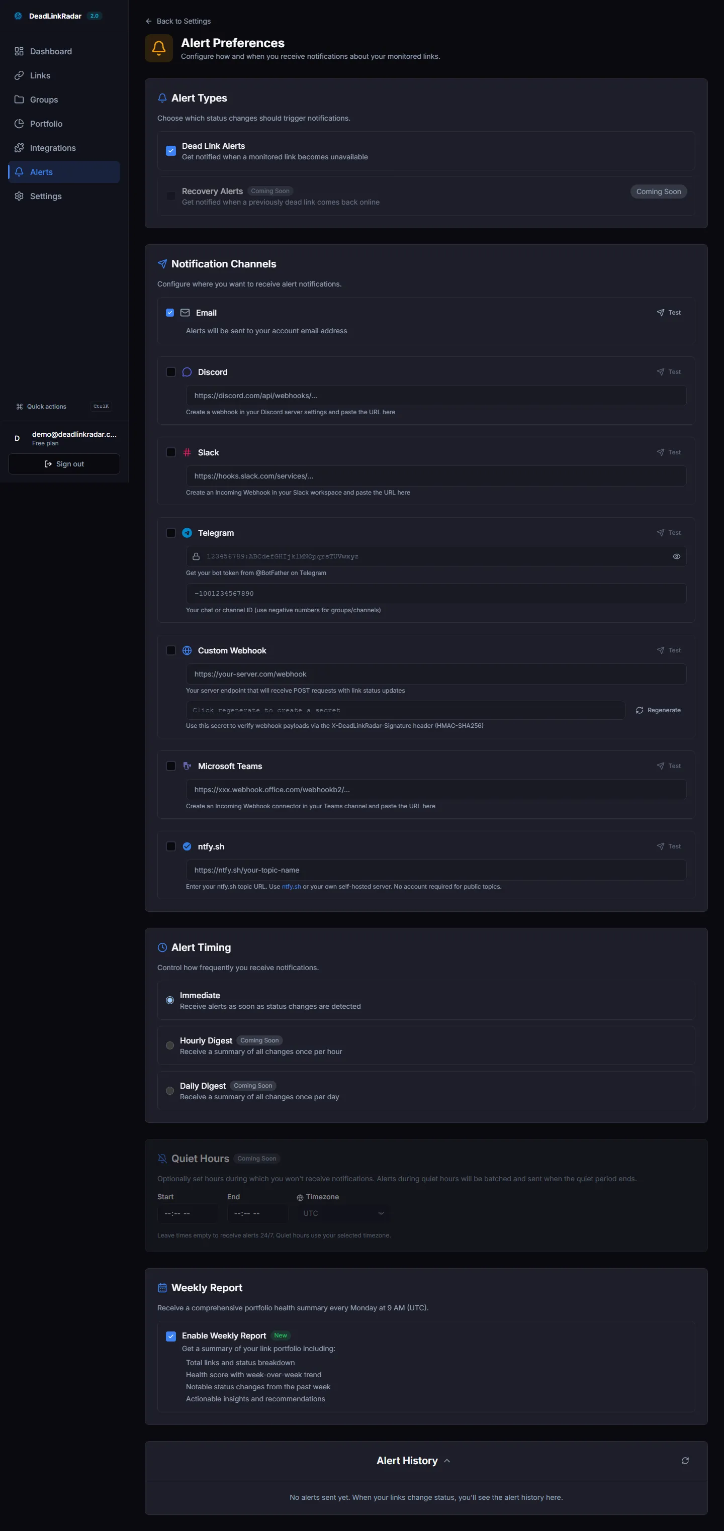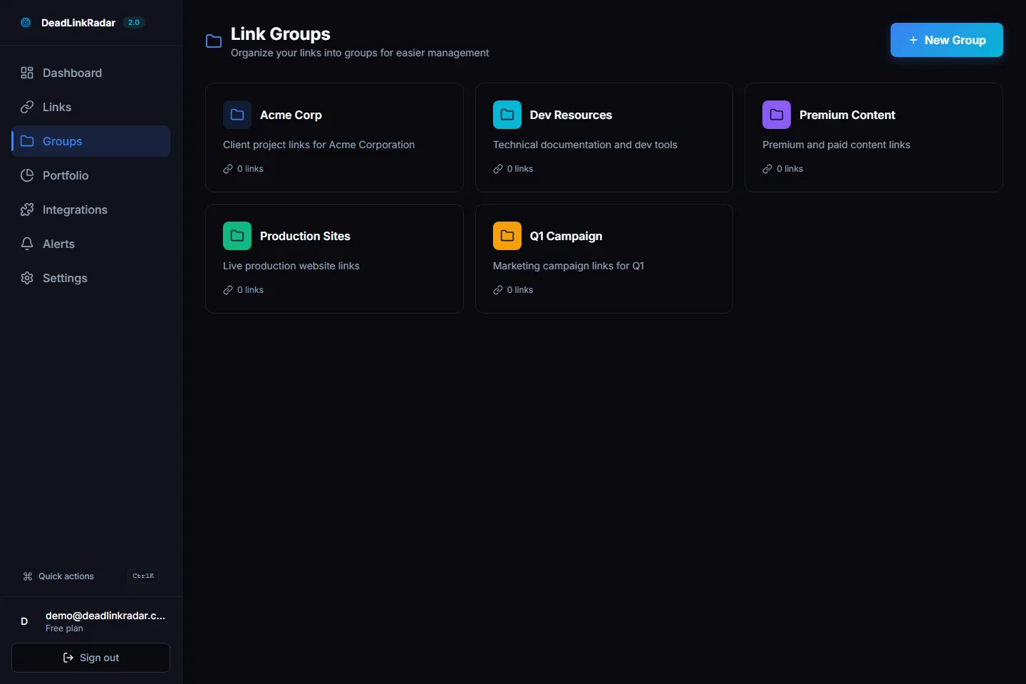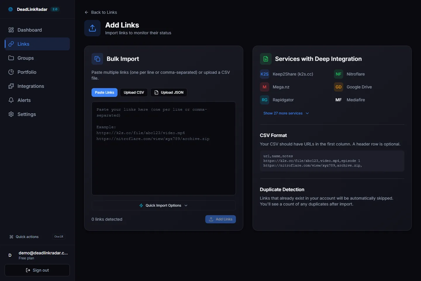 - Sign up for DeadLinkRadar — the free tier lets you monitor up to 50 links