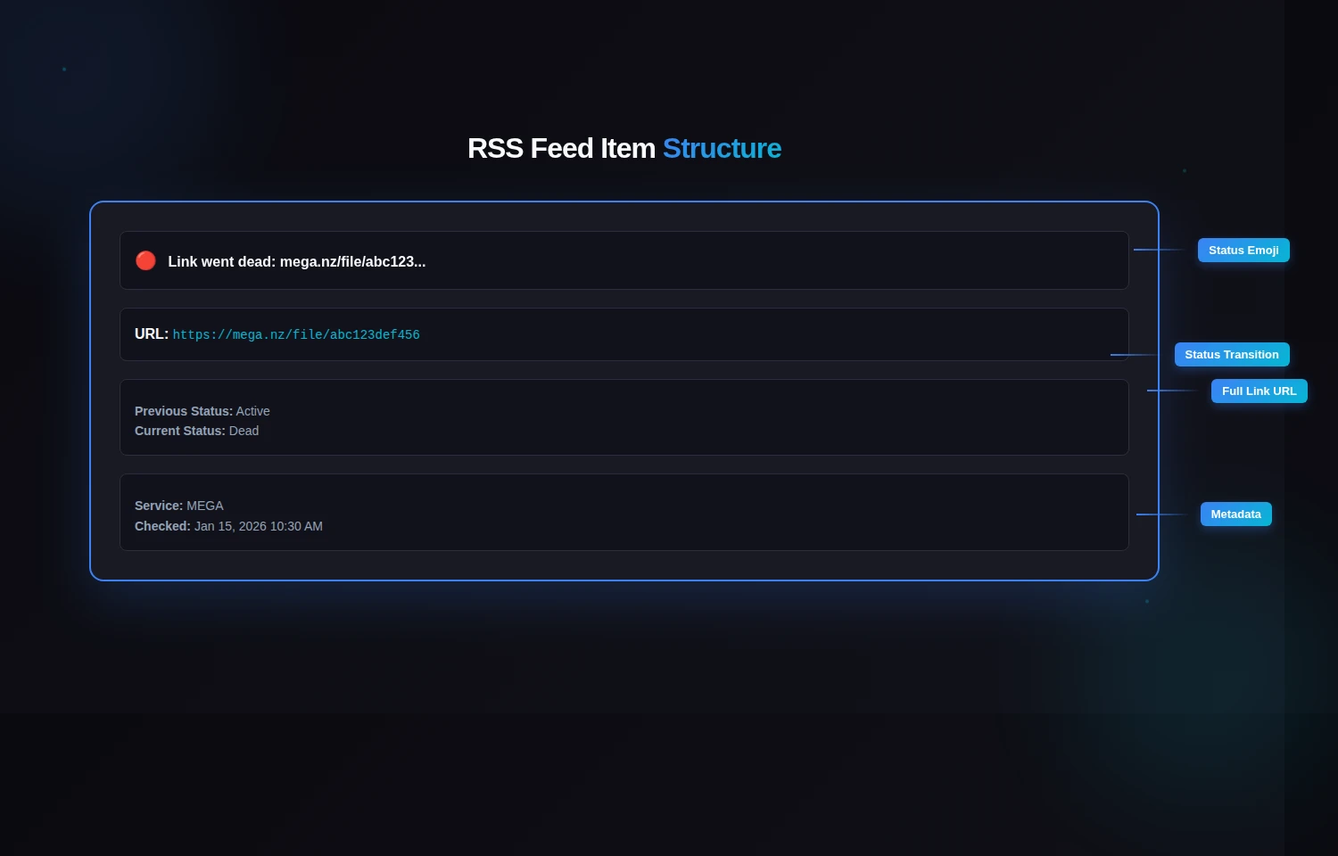 DeadLinkRadar's RSS feed follows the RSS 2.0 specification with Atom namespace extensions for improved compatibility. Each status change becomes a distinct feed item with standardized formatting.