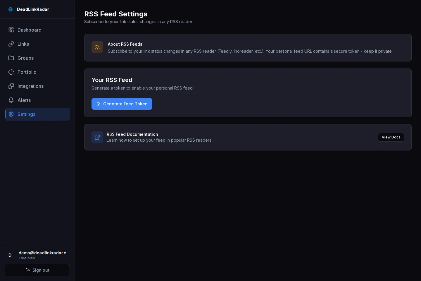 Click "Generate Feed Token" to create your personal RSS feed URL. DeadLinkRadar generates a cryptographically secure token, hashes it with bcrypt, and stores only the hash server-side. The plaintext token appears exactly once—in the feed URL displayed after generation.