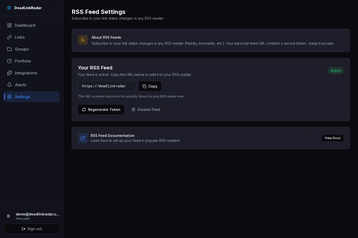 https://deadlinkradar.com/api/v1/feed/rss?token=YOUR_SECURE_TOKENClick the "Copy" button to copy the entire URL to your clipboard. The button changes to show a checkmark for 2 seconds, confirming the copy succeeded.