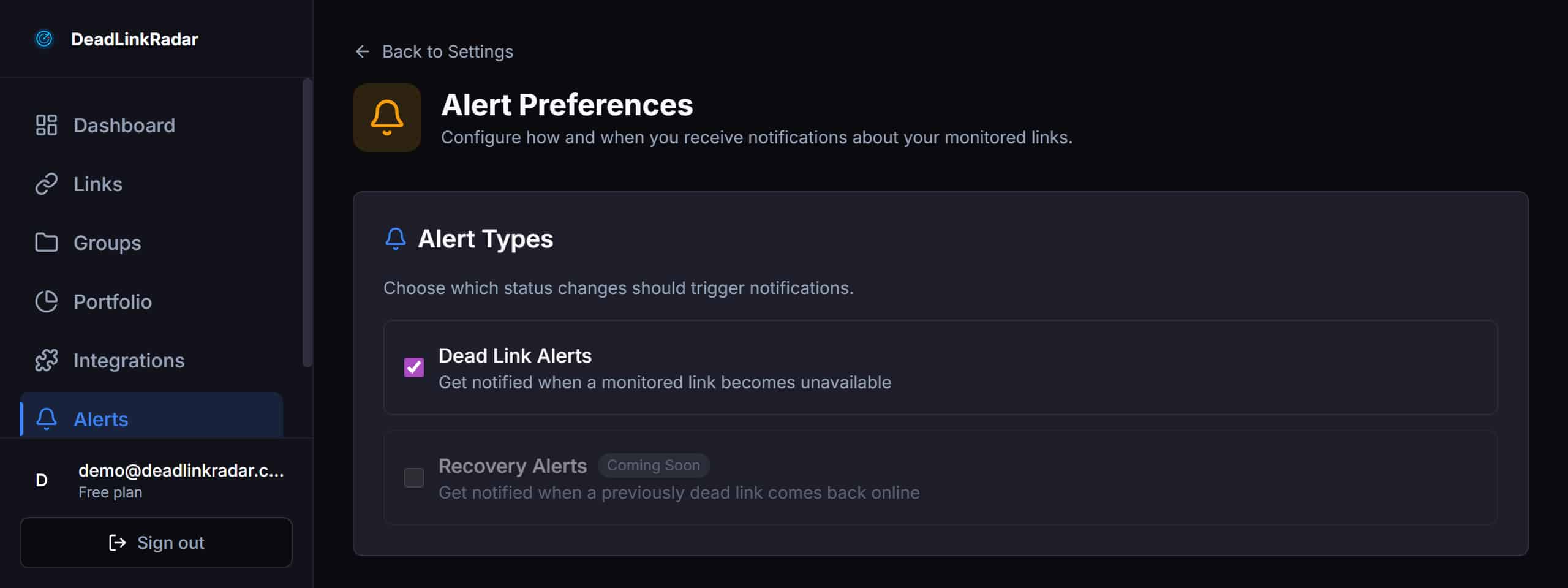 DeadLinkRadar sends email alerts via Resend (our email provider). You'll see: