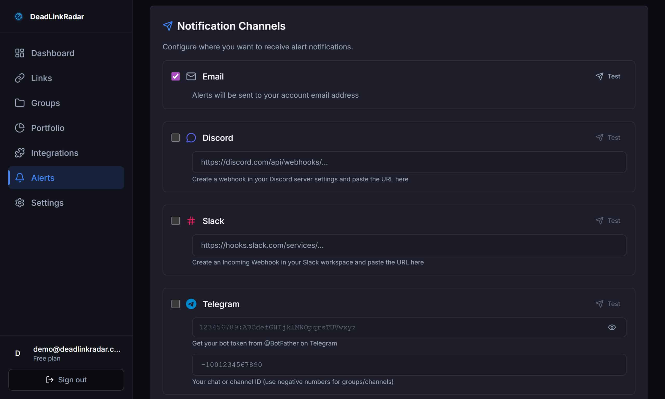 DeadLinkRadar supports 6 notification channels, each designed for different workflows: