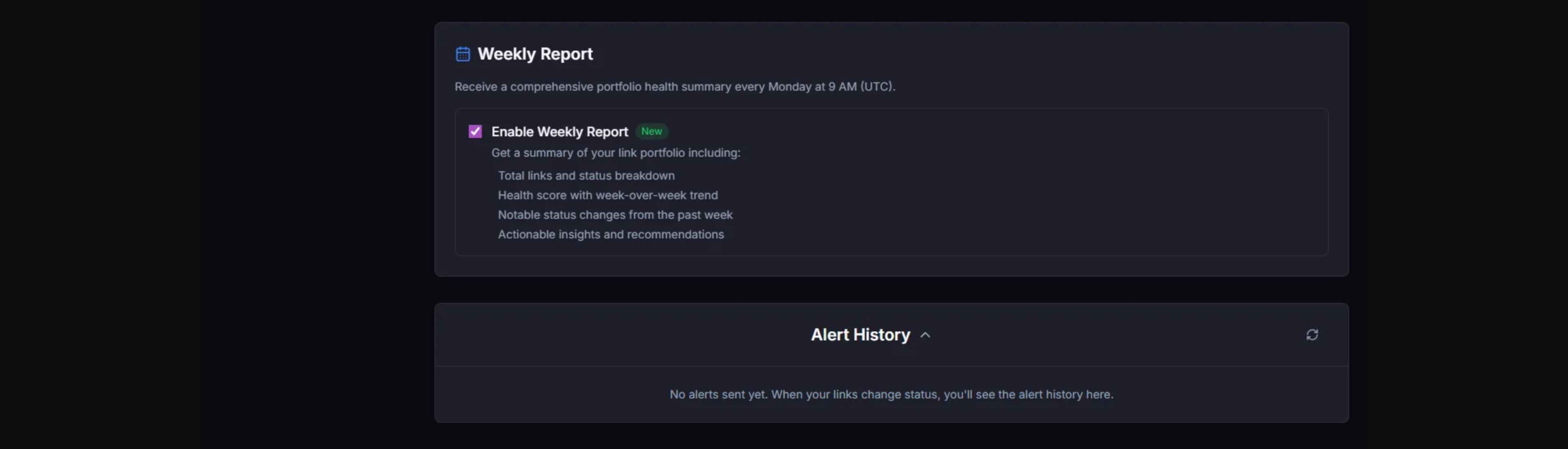 Missing status changes: If your weekly report doesn't show links you know changed status, confirm the specific alert types are enabled. For example, if you disabled "notify on dead links," those status changes won't appear in your digest even though they happened.