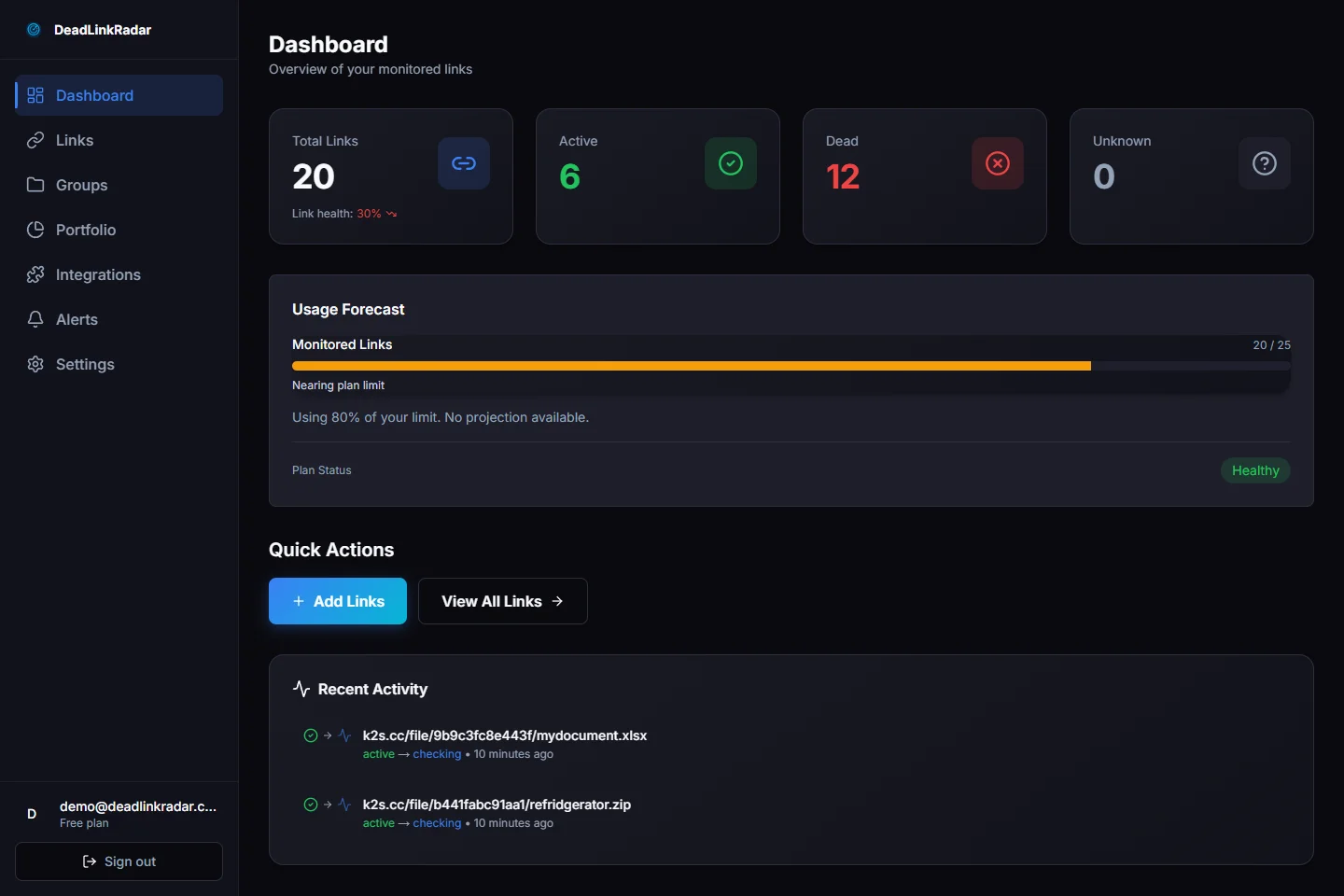 Ready to automate your link monitoring? Enable weekly digests in your dashboard and reclaim those hours you've been spending on manual checks. Questions? Reach us at support@deadlinkradar.com.